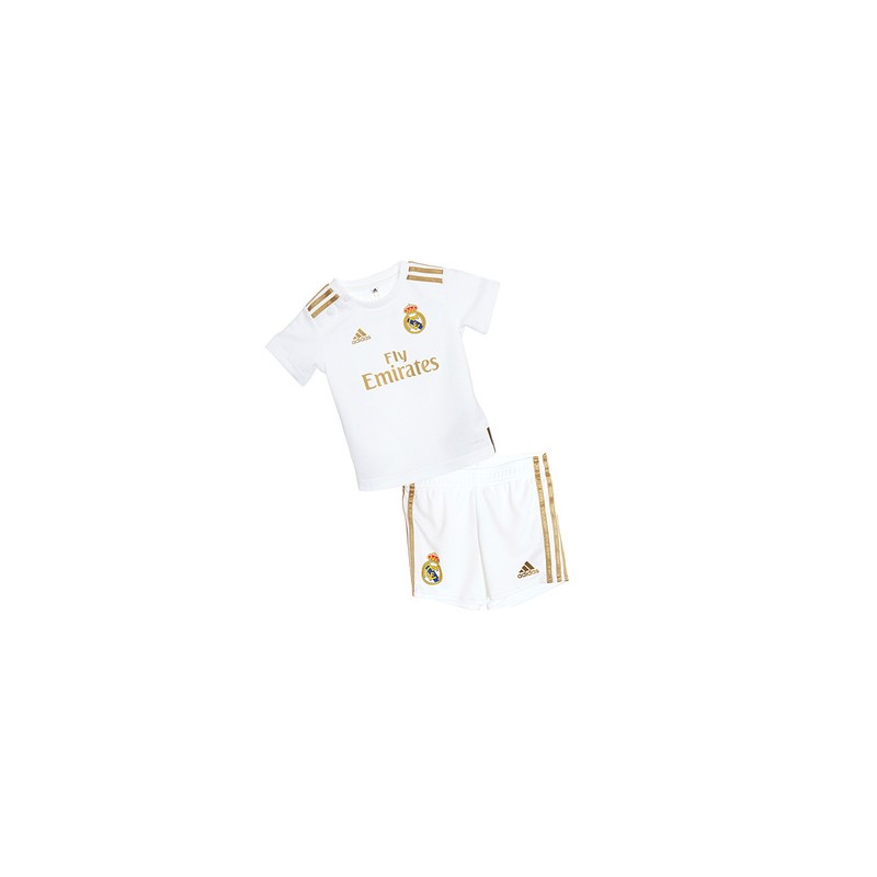 Deja que tu hijo juegue y tome de inspiración a las estrellas del Real Madrid con el uniforme Real Madrid 19/20 Local. Esta es la versión miniatura del uniforme que usan los profesionales en el campo de Bernabéu. Está todo construido en TEJIDO ABSORBENTE CLIMALITE para eliminar el sudor de la piel y mantenerte con comodidad en todo el partido.